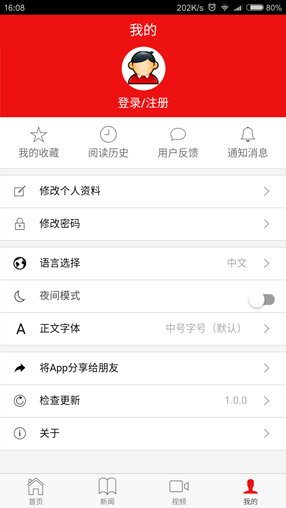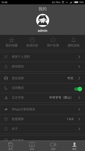 注册登录、忘记密码、修改个人资料、收藏、阅读历史、反馈、通知消息等